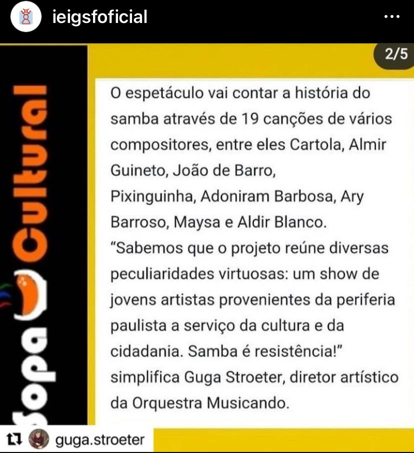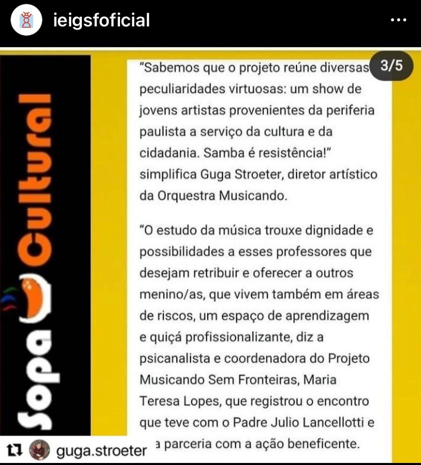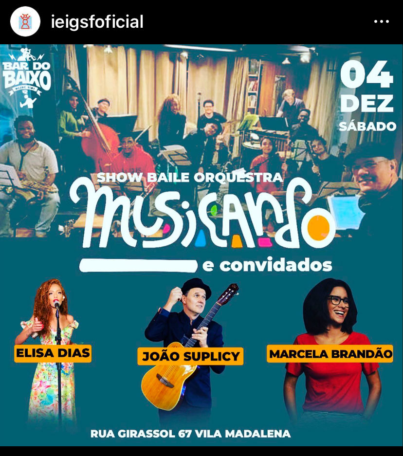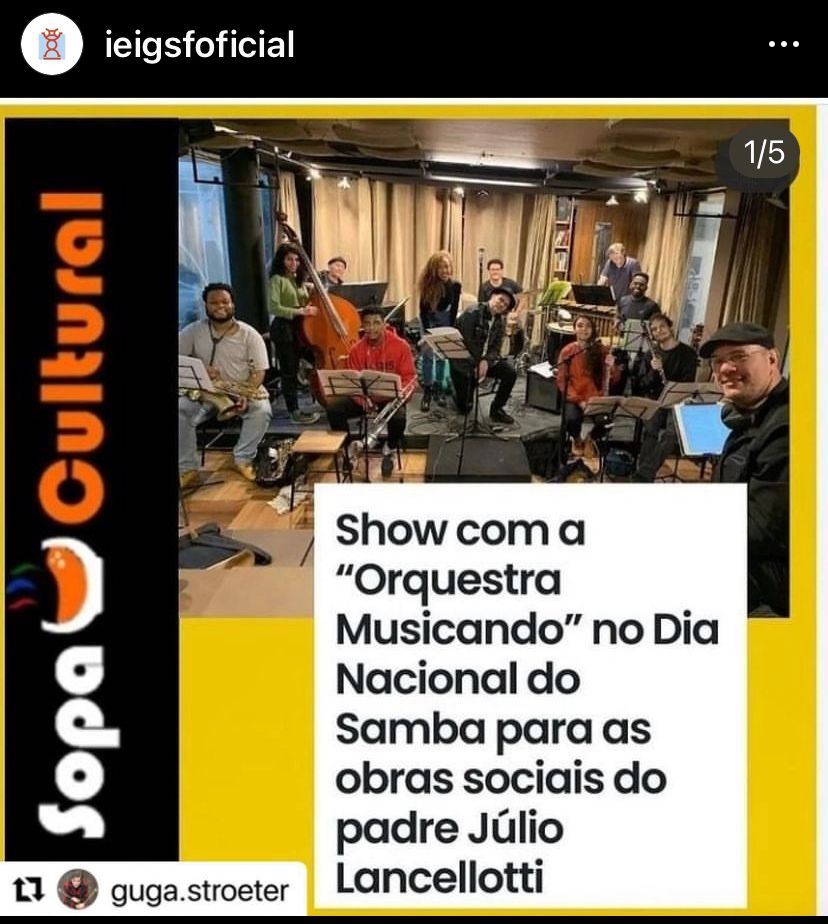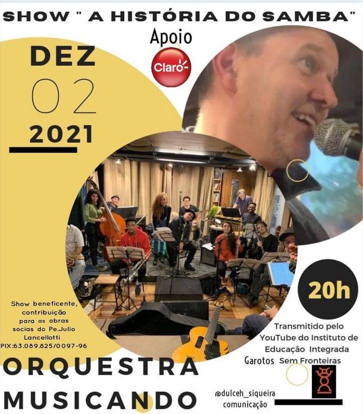 DEZ/2021 – Com apoio do Instituto Claro, realizou Show beneficente para a campanha contra a fome, proposta pelo Padre Júlio de Lancellotti sob o título: “A historia do samba”. Show de exibição on-line em função da pandemia. Pode ser visto na integra pelo canal do Youtube do Instituto de Educação Integrado Garotos Sem Fronteiras.