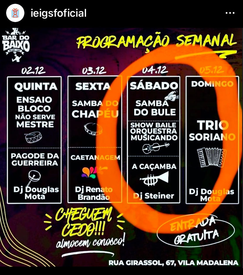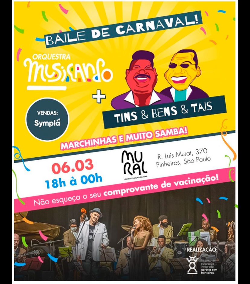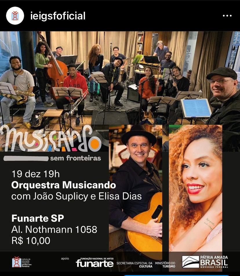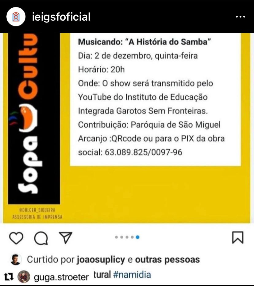 DEZ/2021 – Com apoio do Instituto Claro, realizou Show beneficente para a campanha contra a fome, proposta pelo Padre Júlio de Lancellotti sob o título: “A historia do samba”. Show de exibição on-line em função da pandemia. Pode ser visto na integra pelo canal do Youtube do Instituto de Educação Integrado Garotos Sem Fronteiras.
